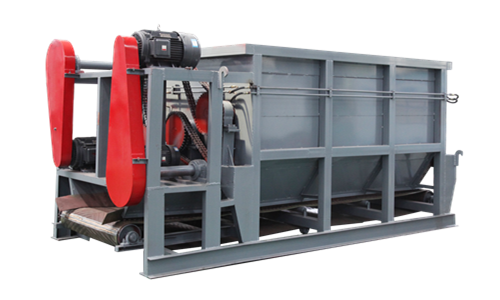 采用敞开料仓,一头进料,另一头出料的流水线式作业,克服了现有剥皮机停电进料、出料,分段式工作方式的缺点,工作效率高。